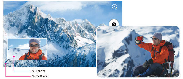 被写体と撮影者を同時に撮影できるマルチカメラを新搭載。メインカメラとサブカメラを同時撮影し、それぞれを組合せて1枚の写真、動画として撮影することができます。