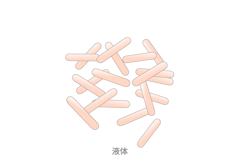物質には、主に「固体」「液体」「気体」3種の形状が存在していますが、固体と液体双方の性質を兼ね備えた物質状態が「液晶」です。固体、液体、液晶それぞれ、物質を形作る「分子」の配置が、下記のようなかたちになっている必要があります。