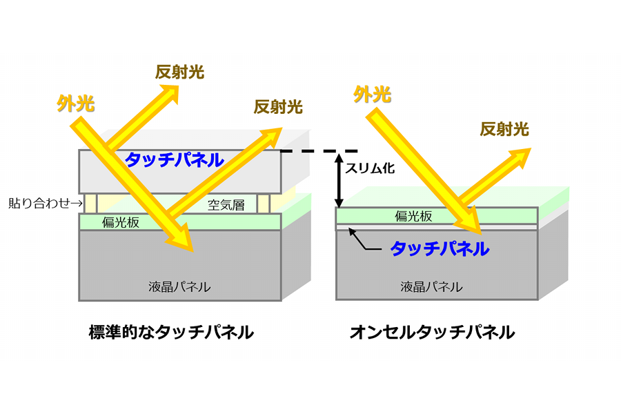自由度の高い成膜プロセスを使えば、ガラス上に透明導電膜の成膜も可能です。標準的な静電容量タッチパネルは、液晶ディスプレイの上に貼り合わせる構造です。京セラのオンセルタッチパネルはガラス上に直接静電容量タッチパネルを形成できるので、スリムなタッチパネル付液晶ディスプレイとなります。また、空気層が無くなることで、反射光が軽減されクリアな表示を実現できます。