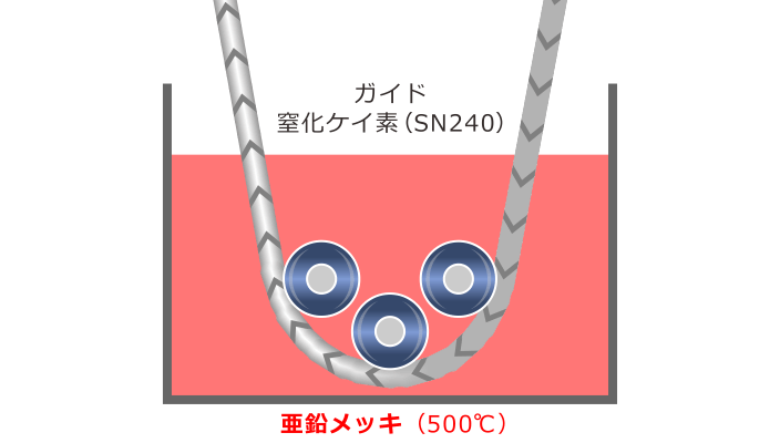 約500℃の溶融亜鉛メッキ槽に鋼線を通すときのガイドの材質を溶融シリカから窒化ケイ素に変更しました。