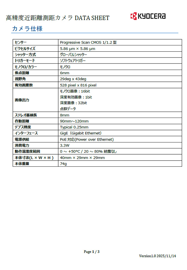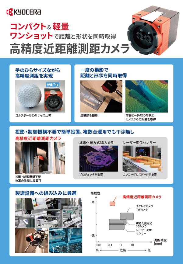 京セラがこれまで培った“光学技術”と“AI技術”の融合により実現したステレオカメラ方式の3Dカメラです。