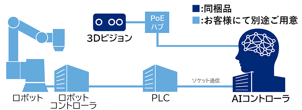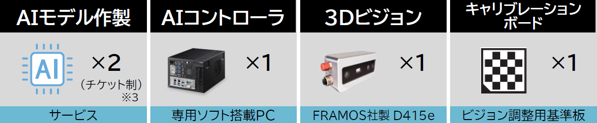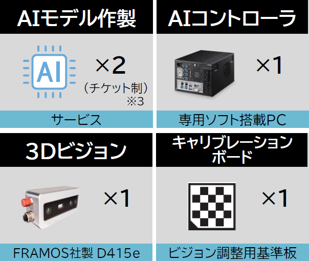 - 23Dビジョンをロボットアームへ取付ける部材ならびに3DビジョンとAIコントローラを接続するためのイーサネットケーブルは含まれません