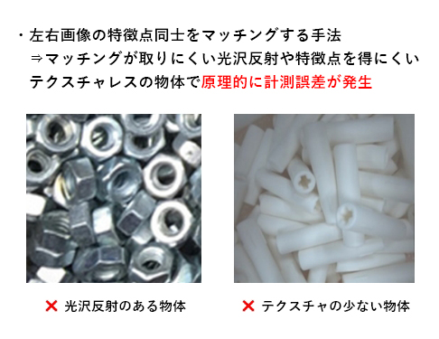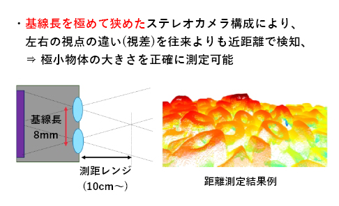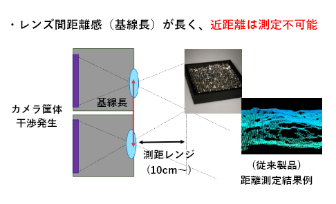 ・「基線長の制約」による近距離。測定の困難さを、狭基線設計(基線長8mm)で克服しました。