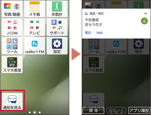 ホーム2枚目の「通知を見る」をタップするだけで、通知パネルの内容を確認することができます。