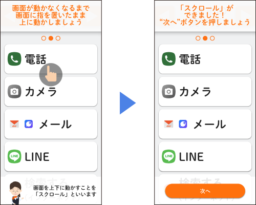 スマホの基本を、自分で操作しながら自分のペースで学べます。スマホがはじめての方にも安心。