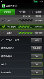 「省電力ナビ」。マイ省電力を選ぶと、バックライト消灯時間や画面の明るさなどを自分好みにカスタマイズできる
