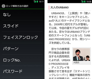 ディスプレイは4.7インチのHD表示が可能なTFT液晶を搭載する。昨年のURBANO PROGRESSOの4.0インチのワイドVGAに比べると、表示エリアがひと回り大きくなり、ブラウザの文字などもグッと視認性が良くなったが、これに加え、文字表示をAndroid標準の中サイズの約1.75倍に拡大する「でか文字」もサポートされている。ディスプレイサイズの大型化はボディサイズにも直接、影響が出るものだが、URBANO L01のボディ幅はURBANO PROGRESSOの約64mmからわずか1mm増の約65mmに抑えられており、重量もわずか1g増の約140gにまとめられている。これくらいのサイズ感であれば、フィーチャーフォンから乗り換えてもあまり違和感なく使うことができそうだ。