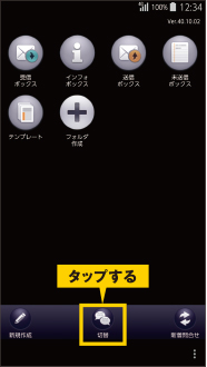 Eメール画面で<切替>をタップするとフォルダモードになります。