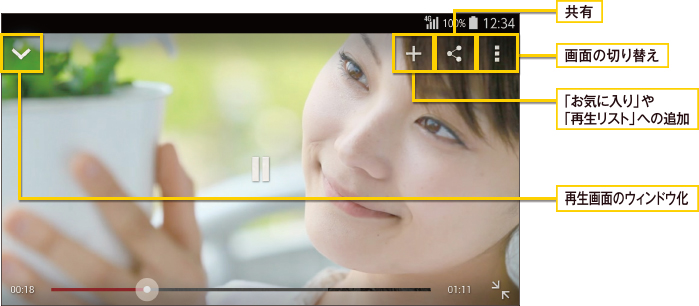 画面をタップすると、一時停止や再生位置を示すバーが表示されます。「