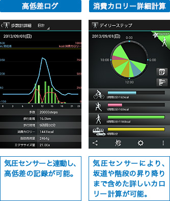 歩数、消費カロリー、移動手段別時間を自動で測定。しかも歩行だけでなく、ランニングや自転車、電車、自動車で移動したときの情報も記録します。さらに、気圧センサーにより、坂道や山登りでのカロリー消費を細かくチェックできるオリジナル機能も搭載しています。