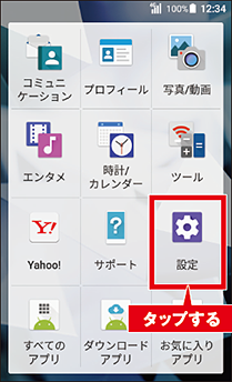 (1) かんたんビギナーホームで「アプリ」→「設定」をタップします。