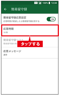 (4) 「応答時間」をタップすると、電話がかかってきたときに簡易留守録で応答するまでの時間を変更できます。