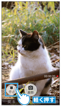(3) 撮影画面に録画時間が表示されます。[停止]を軽く押すと、録画を終了します。