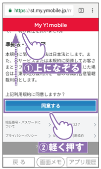 (4) 画面を上になぞり、利用規約を確認し、[同意する]を軽く押します。※2回目以降は利用規約の確認は不要となります。