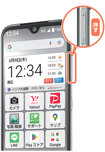 を押し、[マナー(バイブ)]を軽く押すと、マナーモードが解除されます。