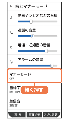 (7) 「マナーモードの使用」の[OFF]を軽く押してマナーモードをONにします。