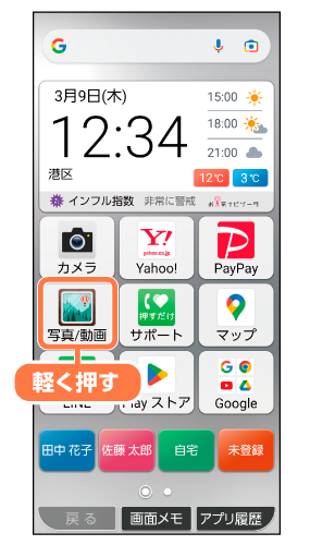 (1) ホーム画面で[写真/動画]を軽く押します。