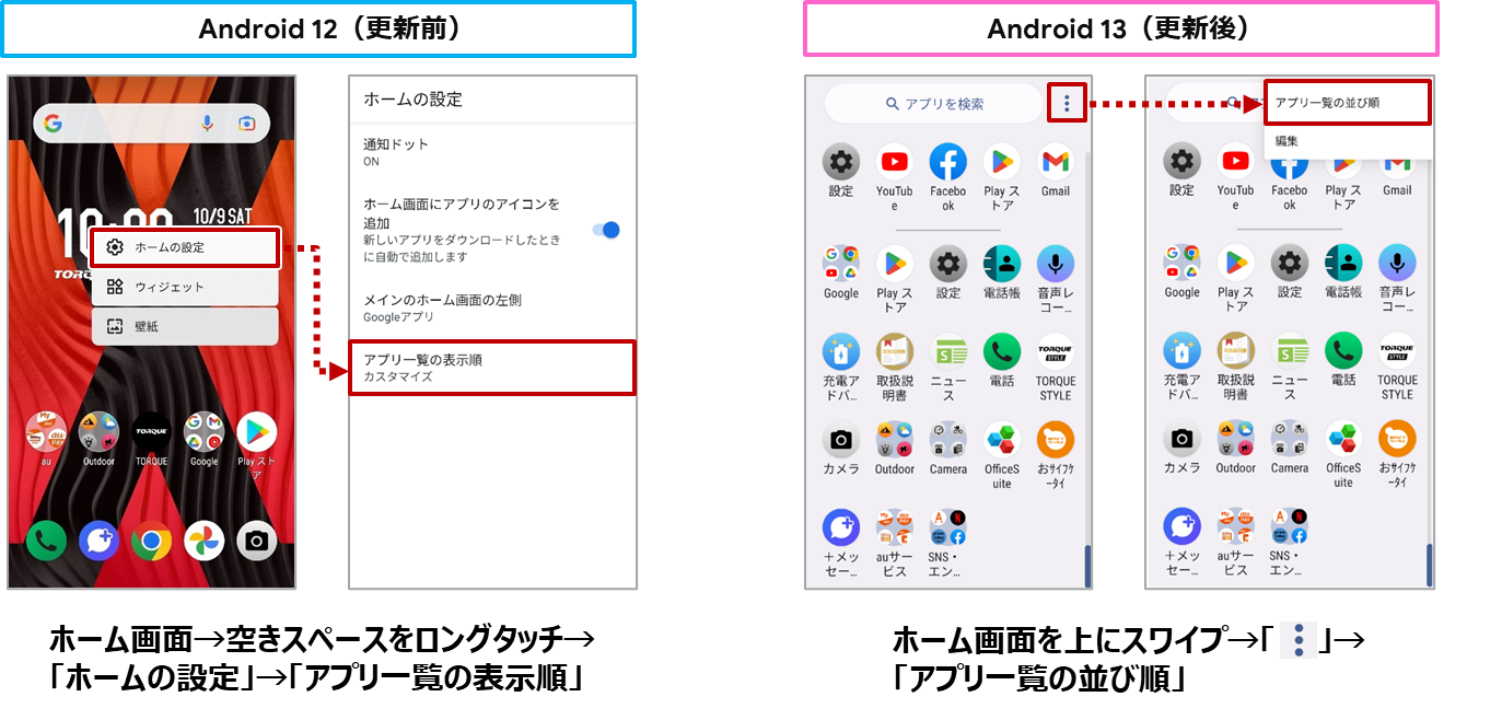 アプリ一覧のアプリの並び順を設定する設定項目が、アプリ一覧で「 ︙ 」をタップしたときに表示されるメニューに移動されます。また、項目名が「アプリ一覧の並び順」に変更されます。