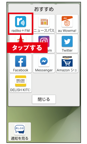 (1) ホーム画面を左にスライドし、[おすすめ]をタップします。