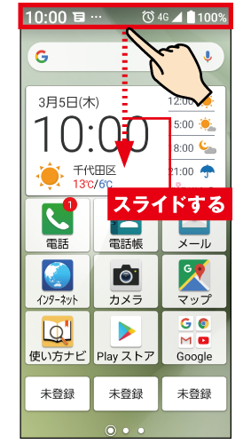 ステータスバーを下にスライドしても、通知パネルを表示することができます。