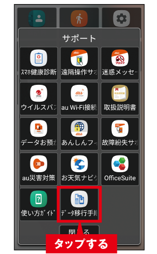 (1) ホーム画面を左にスライドし、[サポート]をタップします。