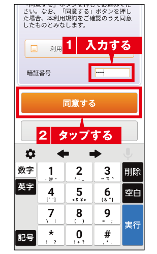 (14) 暗証番号を入力し、[同意する]をタップします。