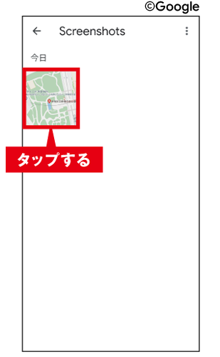 ホーム画面で[フォト]→[アルバム]→[Screenshots]をタップし、閲覧したいスクリーンショットをタップします。