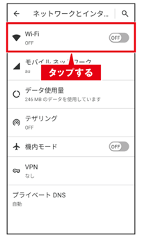 をタップしてWi-Fiのオン/オフを切り替えることができます。