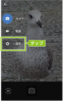 (1) 撮影画面を右にドラッグし、[設定]をタップします。