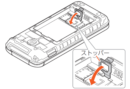 ストッパーがうまく閉じない場合は、いったんストッパーを持ち上げて、au ICカードが正しく奥まで差し込まれているかを確認してください。