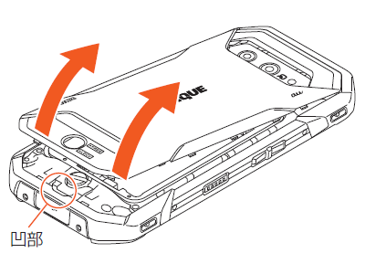 背面カバーの中央の凹部に指先(爪など)をかけて、矢印の方向に持ち上げて取り外します。