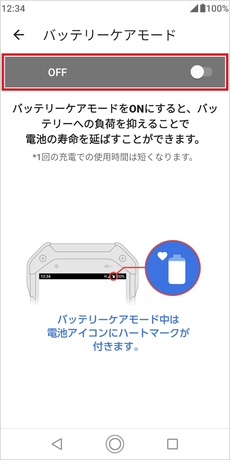 (6)バッテリーケアモードが設定され、電池アイコンにハートマークが付きます。