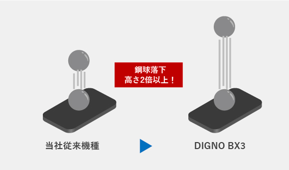 電池の安全性確認のため、 IEC62368-1に準拠した衝撃試験(直径50mm/重さ500gの鋼球を40cmの高さから筐体背面に自由落下させる試験)に加え、2倍以上の高さからの試験を独自に実施しています。