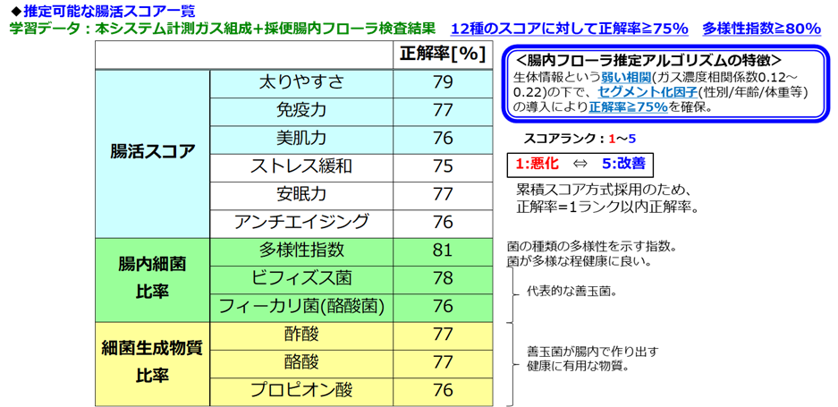 また、これらの菌の情報に基づき、「免疫力」「太りにくさ」「ストレス緩和」「安眠力」「美肌力」などの腸活スコアについても、推測値として算出できる可能性が示唆されています。