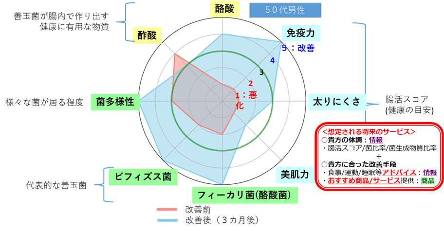 本実証実験では、ビフィズス菌やフィーカリ菌といった菌の比率や菌の多様性の度合い、さらに酢酸、酪酸などの菌が生成する代謝物質の比率について、数値化して示せることを確認しました。