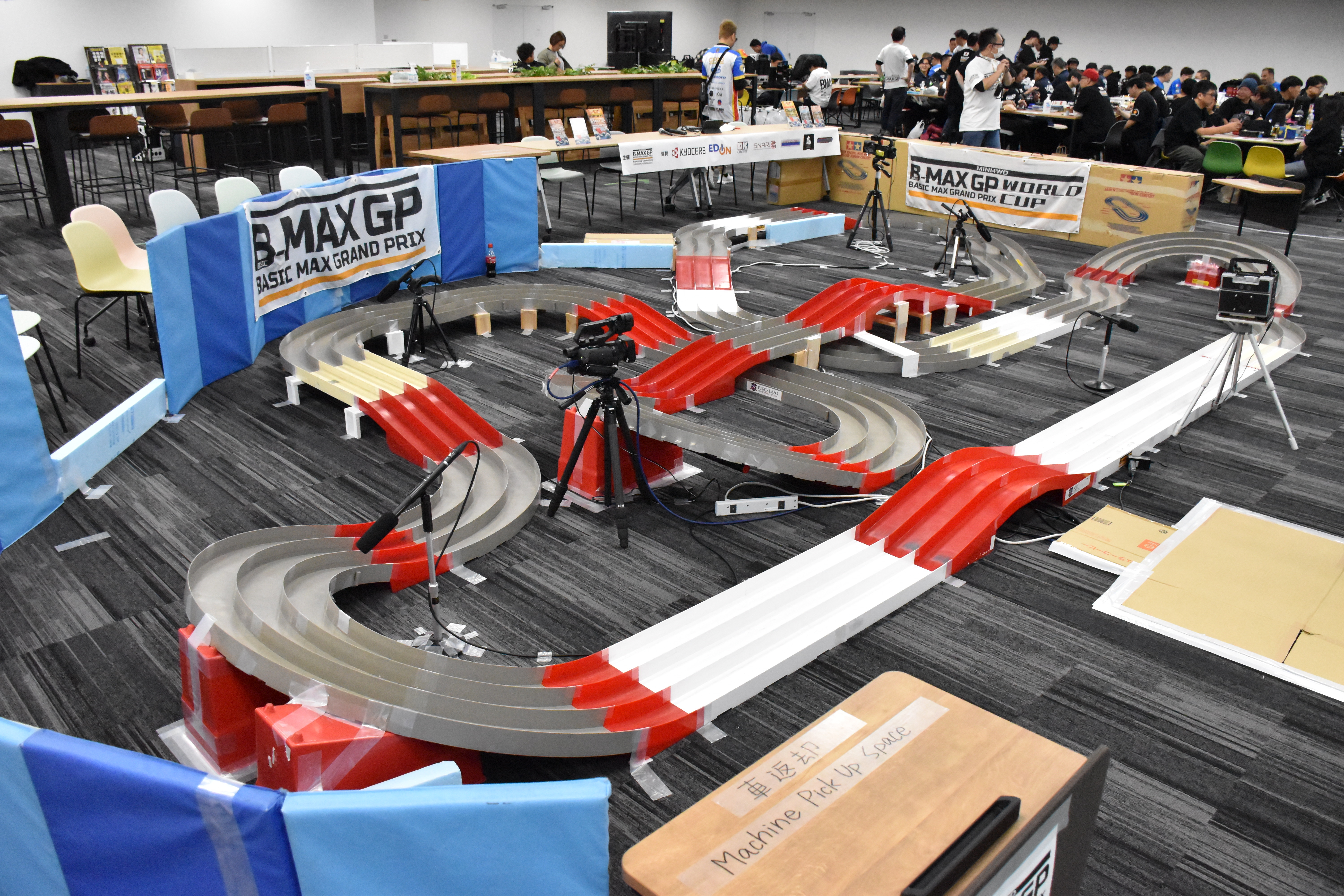 そして会場のもう半分といっていいほどのエリアに圧倒的な存在感で広がるのは、今回の舞台であるミニ四駆サーキットです。事前にコースは公開されているものの、あらためて戦いの場をじっと眺める選手たちの姿が印象的でした。