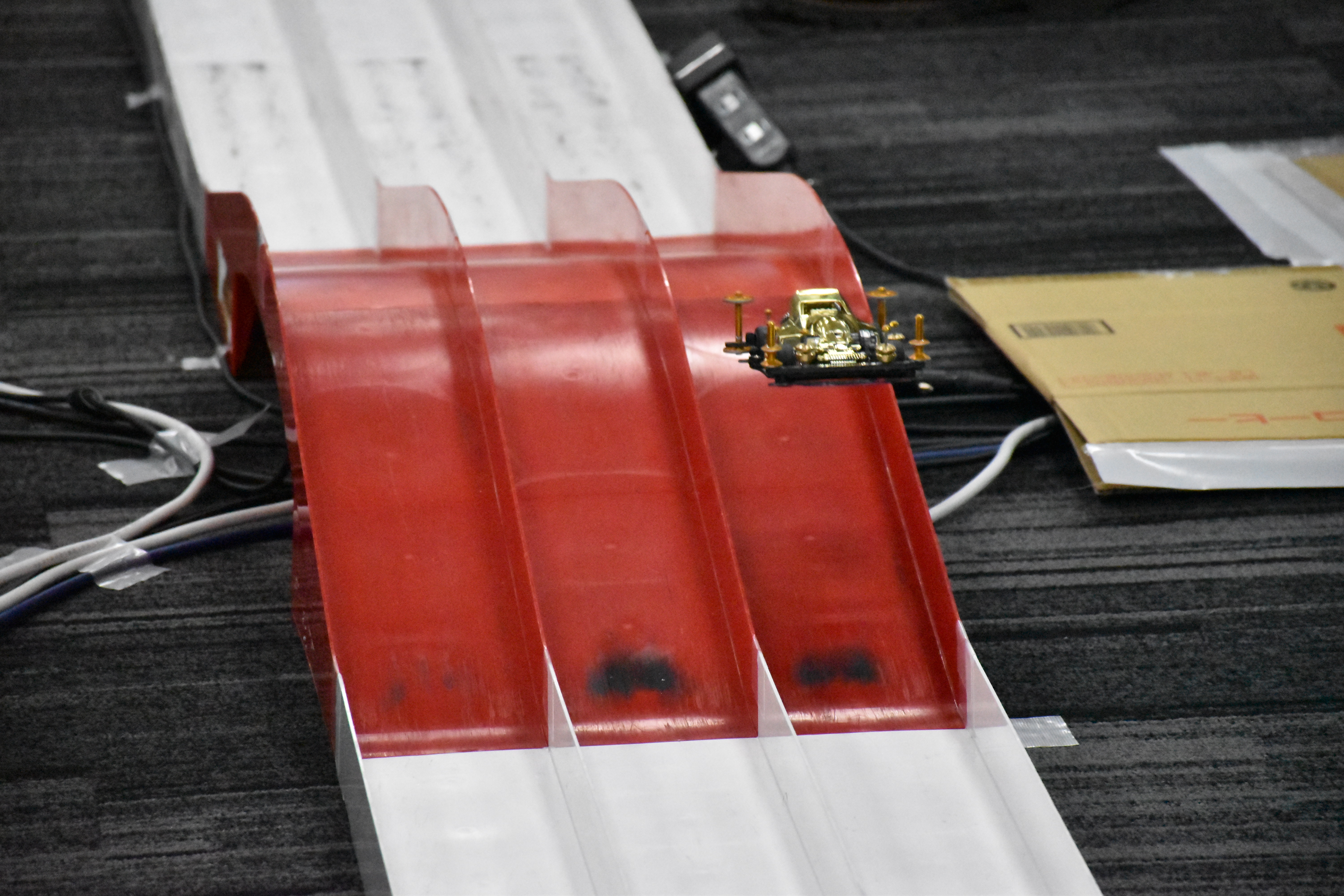 「練習はもはや、本番と同じくらい大切です。勝つためには、当日のコースに合わせてマシンを細かく調整しなければなりません。例えば今回は“ドラゴンバック”と呼ばれるジャンプ台を飛ぶ勢いでコースアウトする可能性があるため、何度もミニ四駆を走行させてブレーキを強めたり弱めたりする必要がありますね。」