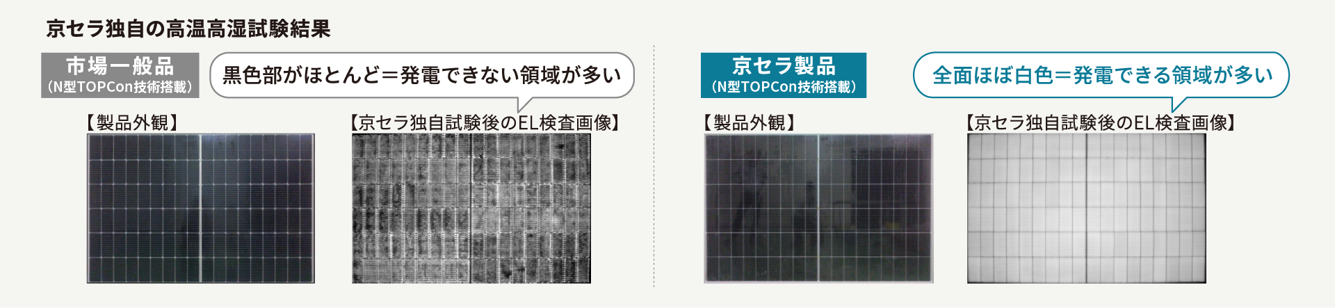 - ●高温高湿試験による出力低下率推移およびEL検査比較は京セラ調べ。