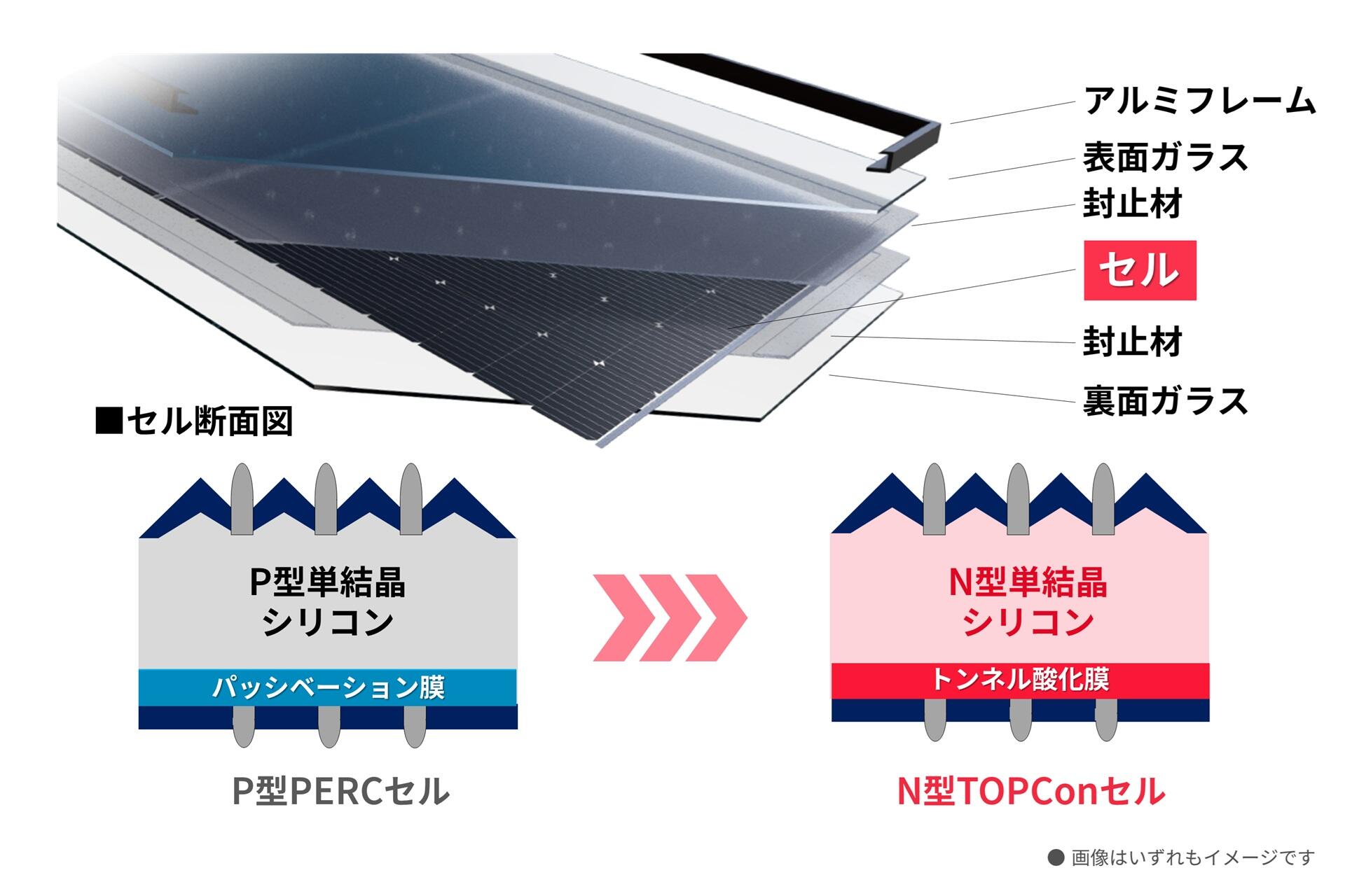 京セラは、これまで主力としてきた P型PERCセルから、N型TOPConセルを搭載した太陽光パネルへと刷新しました。N型TOPCon太陽光パネルは、N型シリコンの裏側に極薄のトンネル酸化膜を用いた特殊な接触構造を採用することで、セル全体の電気損失を抑えます。そのため、同じ面積でもより多く発電でき、限られたスペースしかない案件において、特に高い効果を発揮します。