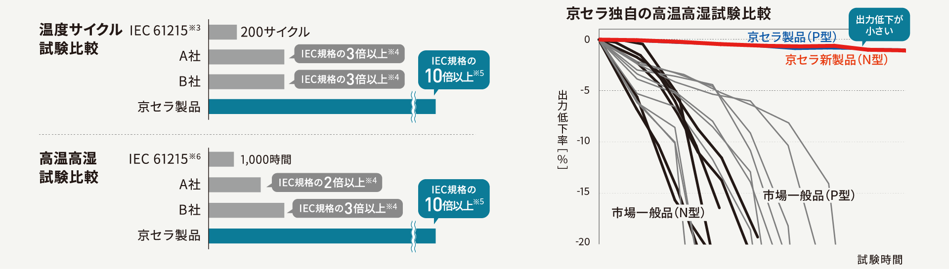 京セラの太陽光パネルは、国際基準であるIEC規格よりも10倍以上厳しい条件での社内試験を経て商品化されています。その試験の1つである高温高湿試験では、市場の一般的なN型TOPCon太陽光パネルの多くが、従来のP型PERC太陽光パネルよりも大きな出力低下が見られました。第三者機関からも市場で流通している一部のN型TOPCon太陽光パネルに対して信頼性の一部に懸念が報告※2されています。