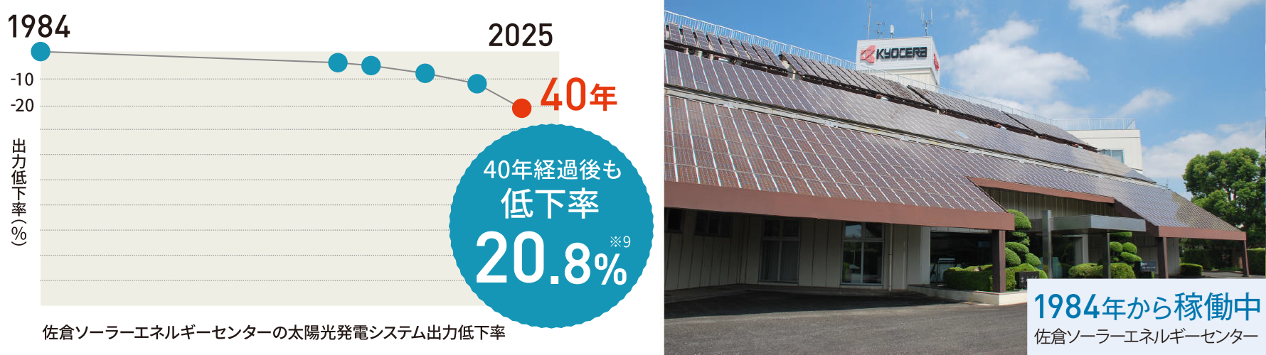 - ※10量産品の住宅用太陽電池の最長使用期間。1993年に国内初の住宅用太陽光発電システムを販売開始。現在も稼働中(2025年5月時点)。京セラ調べ。